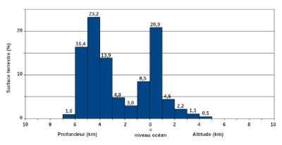 Ainsi, si on considère maintenant une “croute” terrestre superficielle flottant sur un “manteau” terrestre sous-jacent, on peut penser que les différences d’altitude reflètent des différences d’épaisseur. S’il y a une épaisseur “moyenne”, on aura une distribution des altitudes autour d’une altitude moyenne avec des altitudes plus basses correspondant à de la croute moins épaisse et des altitudes plus hautes correspondant à de la croute plus épaisse. On s’attend alors à une distribution ”simple”, monomodale des altitudes, les variations s’expliquant par des processus d’amincissement ou d’épaississement d’une croute moyenne typique.
