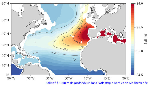Dans l’Atlantique Nord deux processus densifient l’eau de surface initialement très salée issue du Gulf Stream. Il y a tout d’abord le refroidissement des eaux en remontant vers le Nord ainsi que la formation de la banquise (formée à partir d’eau de mer, la banquise est très peu salée, ce qui revient à un export d’eau douce) qui augmente la concentration.
