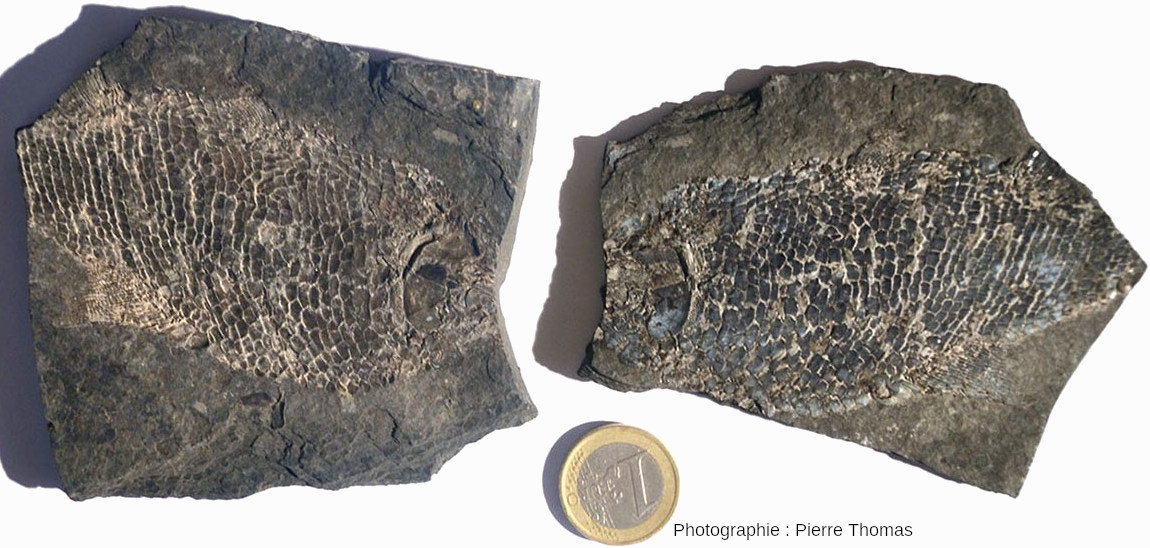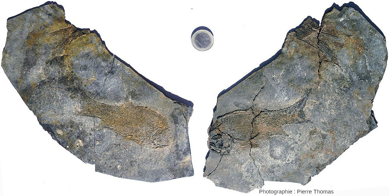 En bas, un poisson entier et, en haut, la queue d'un autre poisson. Cet échantillon vient du Permien inférieur (Autunien) de Bourbon-l'Archambault (Allier).