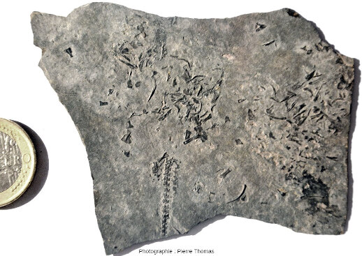 ![]() Source - © 2025 — Pierre Thomas Imparfaitement dégagé et encore recouvert d'une fine pellicule pélitique, ce fossile permet cependant de bien voir (à gauche) les grandes épines qui ont donné son nom à ce groupe. |