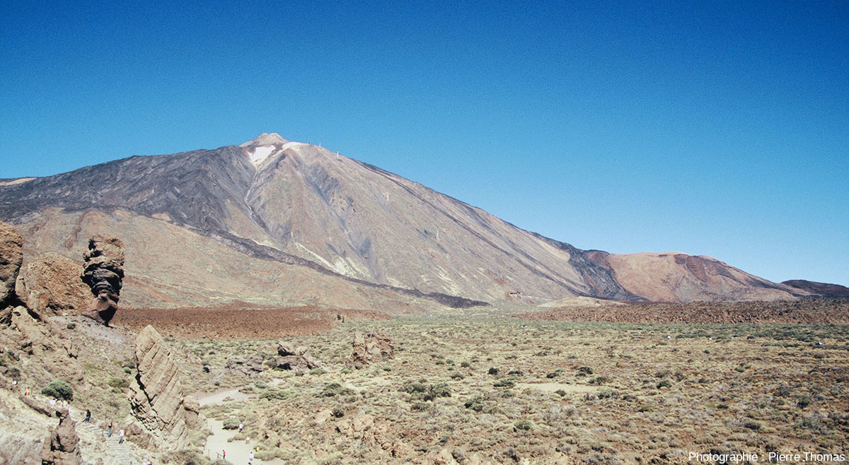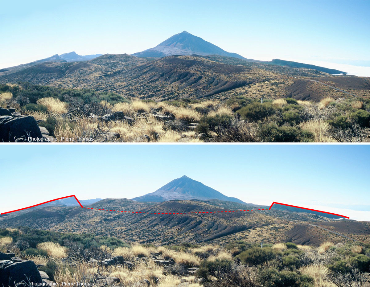 Sur la photo inférieure, les traits rouges visualisent les flancs du volcan de Las Canadas et les remparts de la caldeira. La ligne pointillée rouge localise le fond actuel de la caldeira, caché par les premiers plans. On voit très bien le Teide qui a crû en remplissant la caldeira de Las Canadas. Le Pico Viejo, situé à l'Ouest, est caché par la masse du Teide.