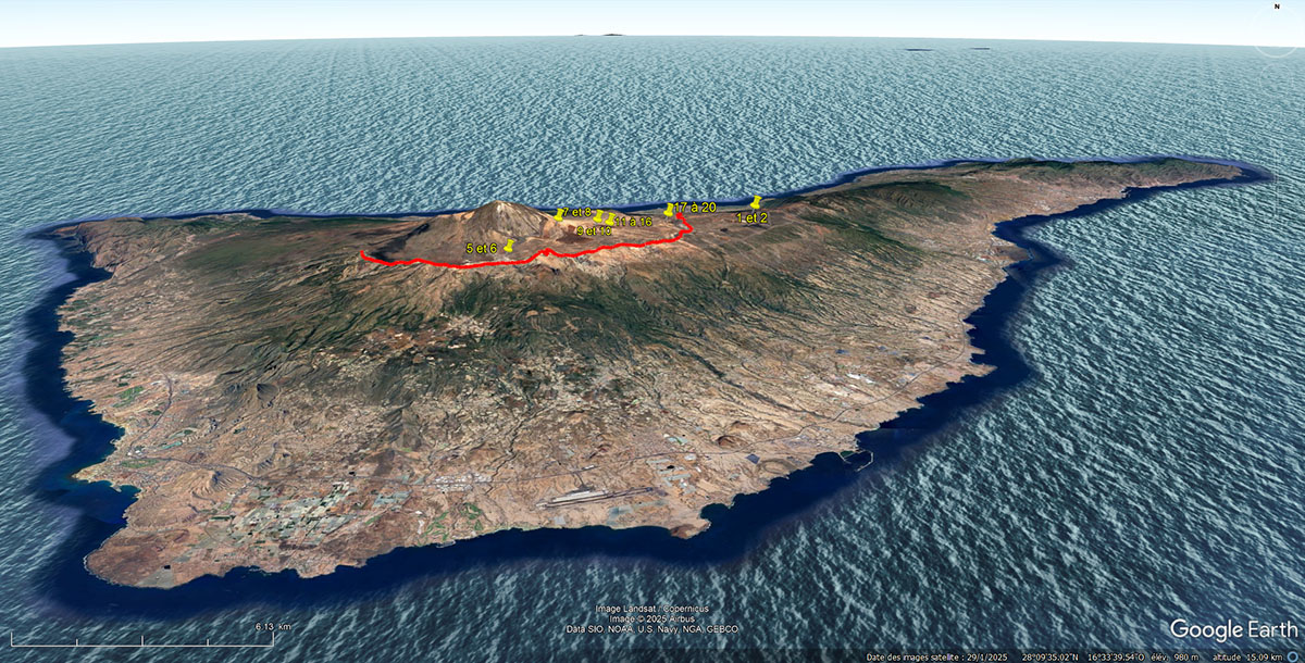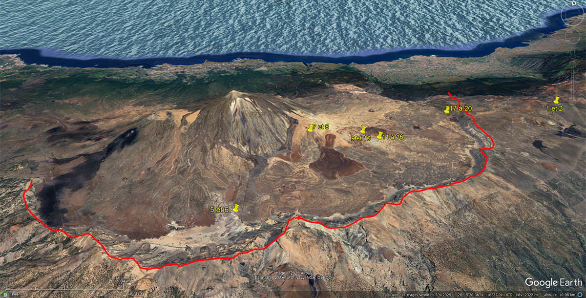 Les trois cinquièmes du tracé de la caldeira encore visible sont figurés en rouge (les 2 autres cinquièmes sont recouverts par les formations du Teide - Pico Viejo). Les chiffres associés aux punaises renvoient aux numéros des figures.