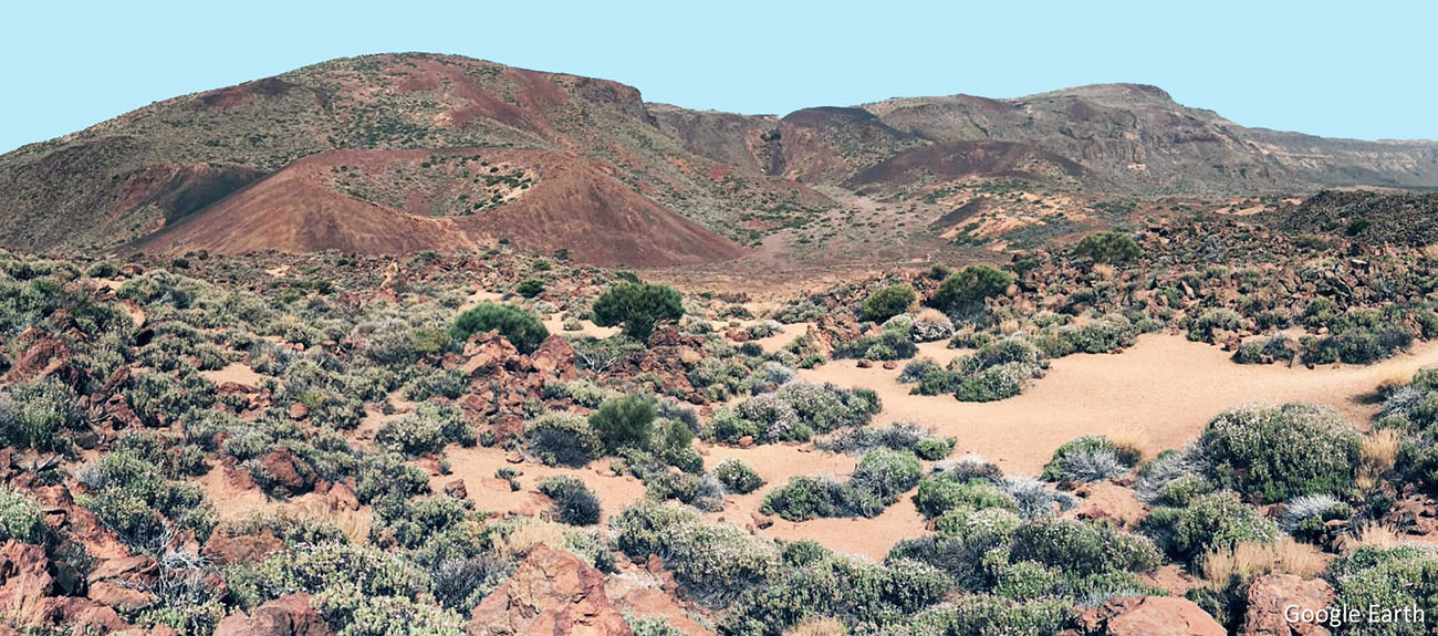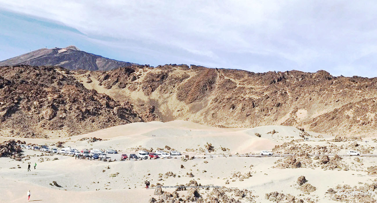 ![]() Source - © 2025 — Google Earth Street View Les deux photos suivantes zooment chacun de ces cônes. À l'arrière-plan, le rempart de la caldeira de Las Canadas. | |