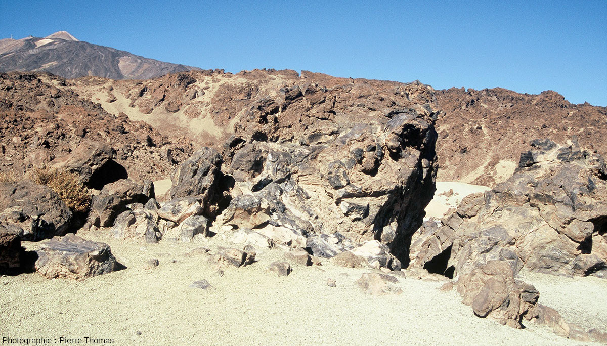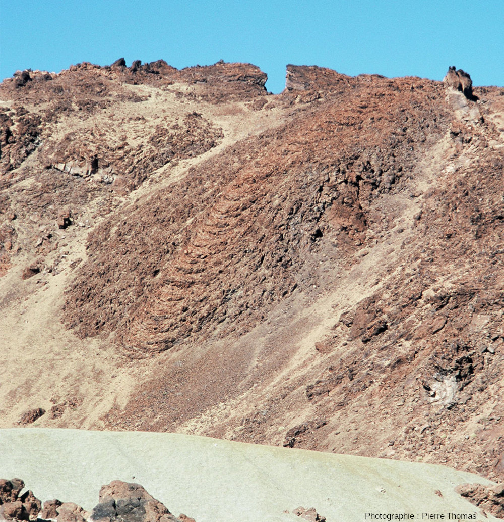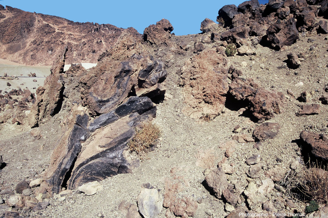 ![]() Source - © 2004 — Pierre Thomas Ces coulées de phonolites noires du Teide sont à l'origine des « œuf du Teide » (cf. Les « œufs du Teide », des boules d'accrétion de lave (ile de Tenerife, Canaries, Espagne)). Les trois coulées rougeâtres sont détaillées à la figure suivante. |