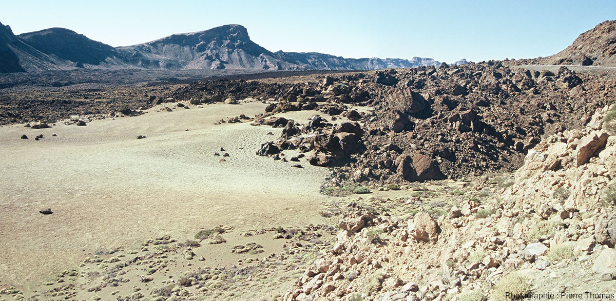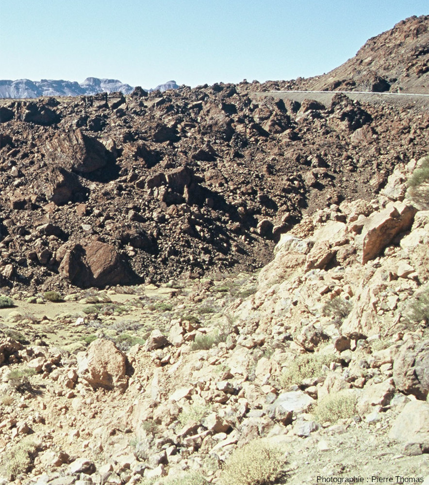 ![]() Source - © 2004 — Pierre Thomas On distingue très bien des coulées sombres, d'autres rougeâtres, recouvrant des terrains plus clairs. Ces couleurs, une fois n'est pas coutume, ne reflètent pas que la chimie de la lave (sombre = lave basique, clair = lave acide) mais surtout sa structure. La majorité de ces roches sont des phonolites mais deviennent très sombres quand leur structure est vitreuse (cf. figures 13 à 16). On devine trois petites coulées rougeâtres sur la droite de l'image. Les deux figures suivantes correspondent à des zooms sur ces coulées, coulant au flanc de ce qu'on appelle la Montana Blanca. |