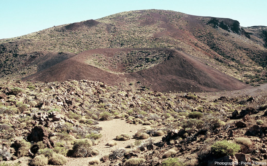 À l'intérieur de la caldeira de Las Canadas, près de son bord oriental, on trouve de petits cônes de scories basaltiques. Ces cônes sont sans doute plus à rattacher à la branche Nord-Est du volcanisme dit ”de rift” qu'au volcanisme du Teide sensu stricto. Les trois photographies suivantes montrent deux de ces petits cônes.