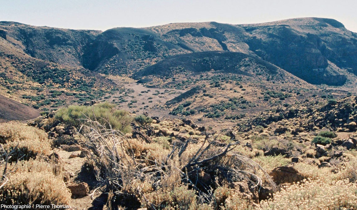 ![]() Source - © 2004 — Pierre Thomas On distingue très bien le rempart Sud de la caldeira (à gauche), et des coulées récentes assez sombres venant de droite et recouvrant des pyroclastites assez claires. |