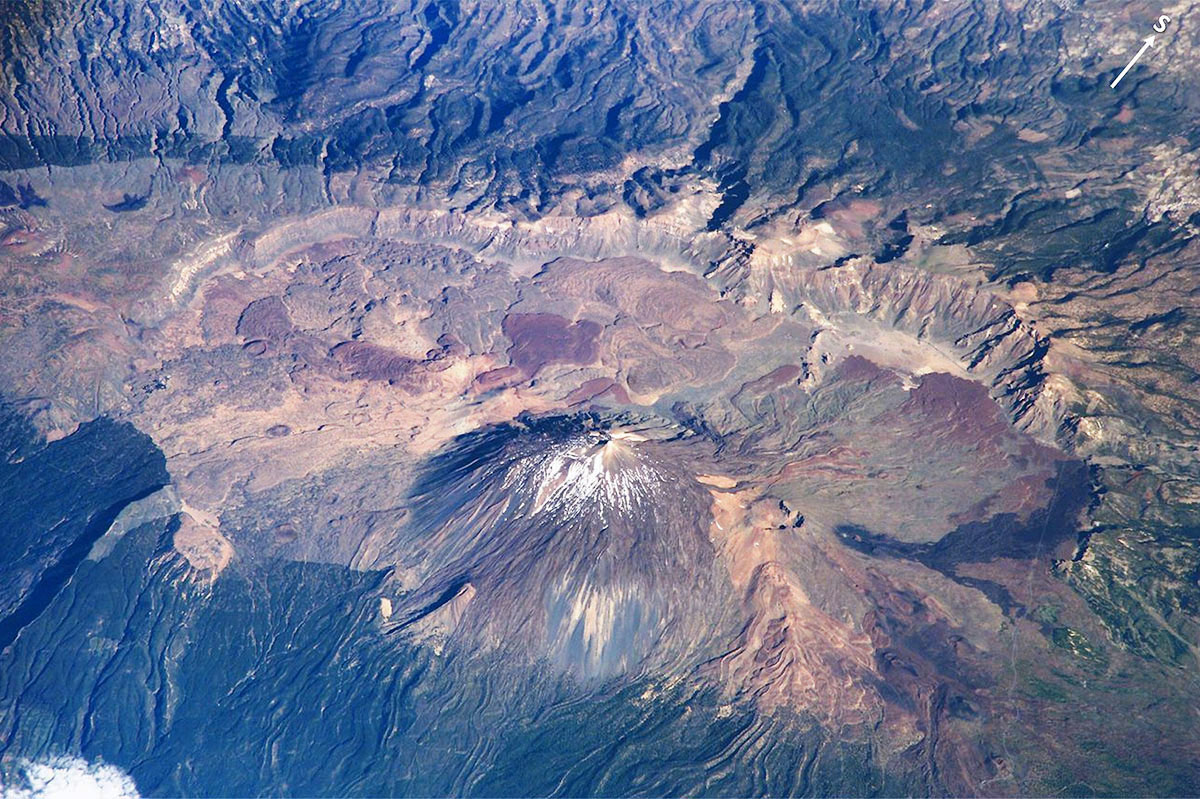 Les deux photographies suivantes correspondent à deux images satellites de la caldeira. La première, non annotée, est une vue dirigée vers le Sud-Est. La deuxième, annotée, est une vue vers le Nord.