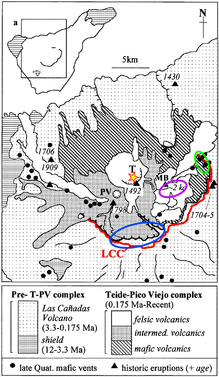 Le Teide (T) est figuré par l'étoile jaune, le rempart de la caldeira par le trait rouge (LCC = Las Canadas Caldera). PV = Pico Viejo et MB = Montana Blanca. L'ovale bleu localise le champ de la figure 5, l'ovale violet localise les courtes coulées de laves visqueuses et les obsidiennes des figures 7 à 16, et l'ovale vert localise les petits cônes de scories basaltiques (figures 17 à 20).