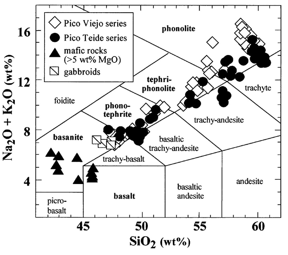 Source : G.J. Ablay, M.R. Carrol, M.R. Palmer, J. Marti, R.S.J. Sparks, 1998. Basanite–Phonolite Lineages of the Teide–Pico Viejo Volcanic Complex, Tenerife, Canary Islands, Journal of Petrology, 39, 5, 905-936 [PDF – Texte intégral(lien externe - nouvelle fenêtre)].