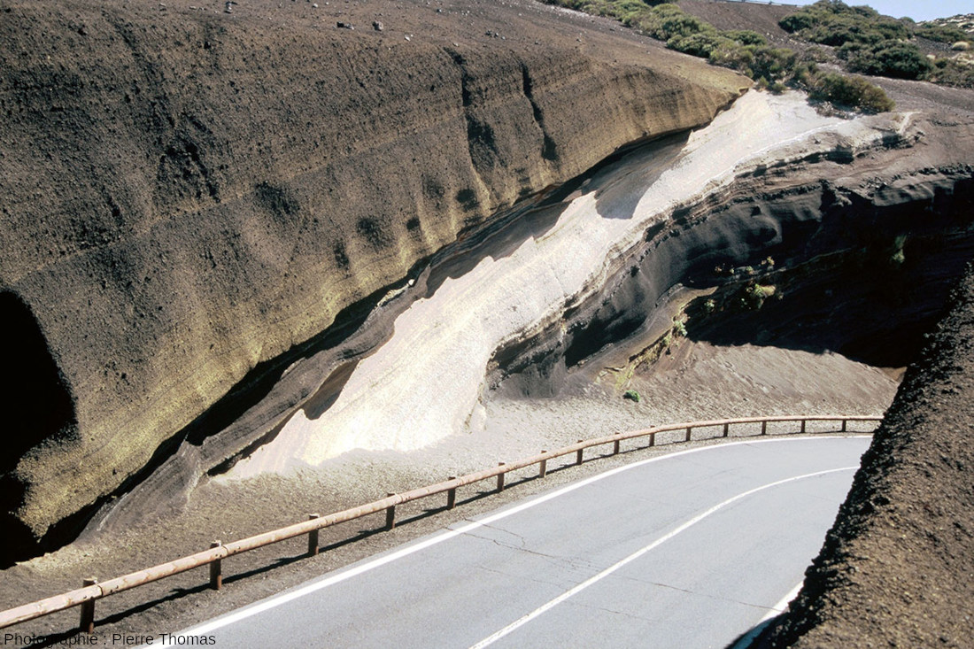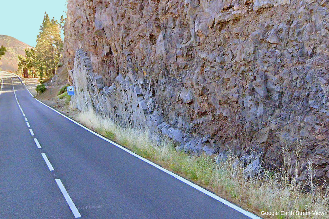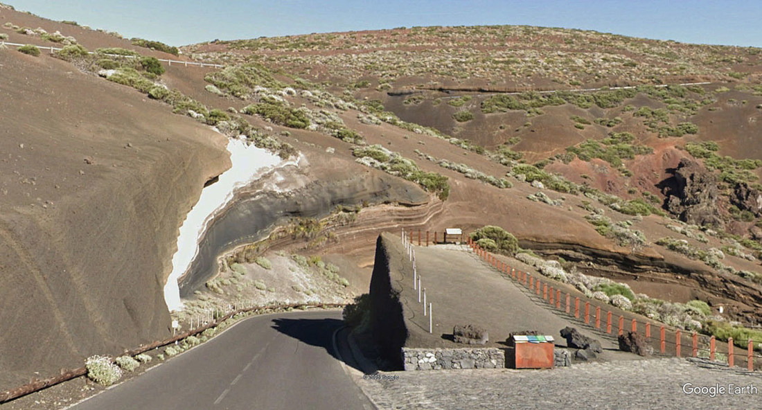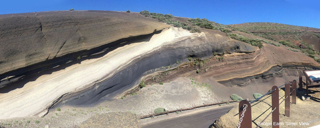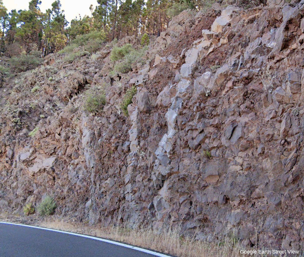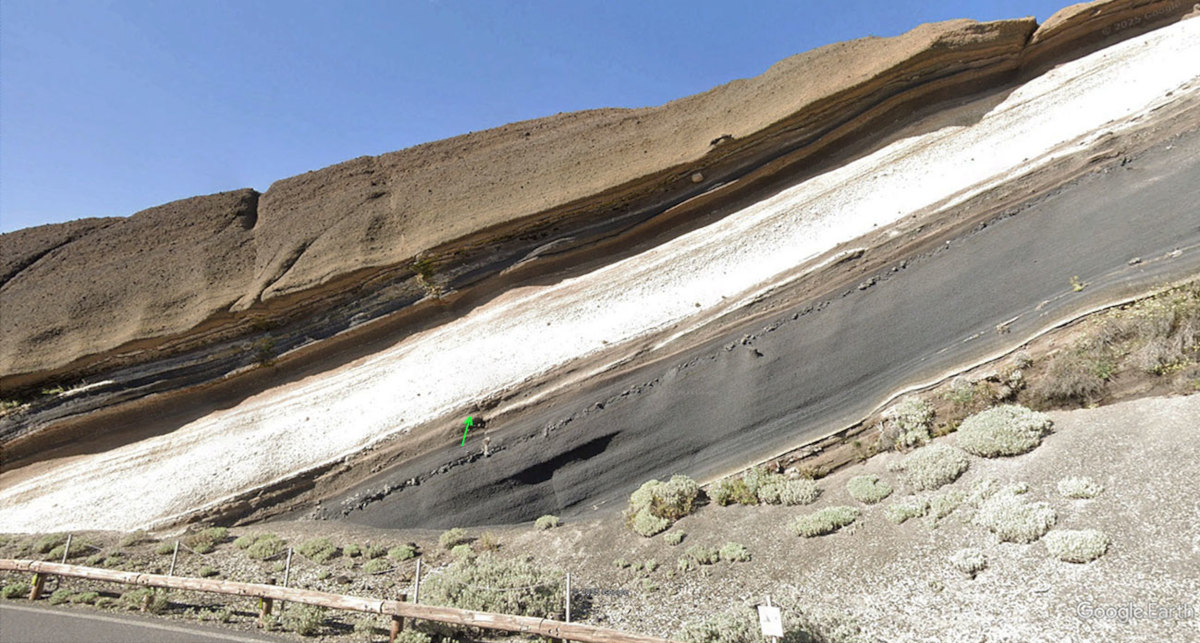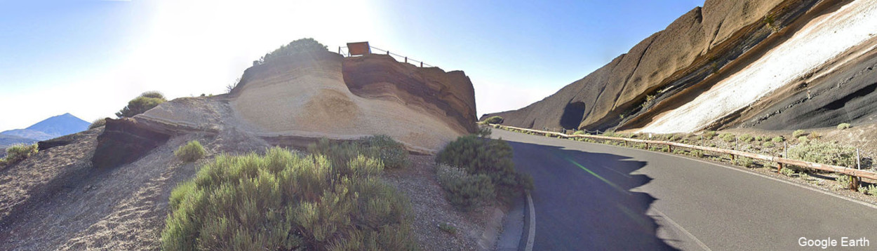![]() Source - © 2025 — Google Earth Street View Au fond à gauche, le Teide, d'où proviennent probablement les pyroclastites acides formant le niveau blanc que traverse la route. |