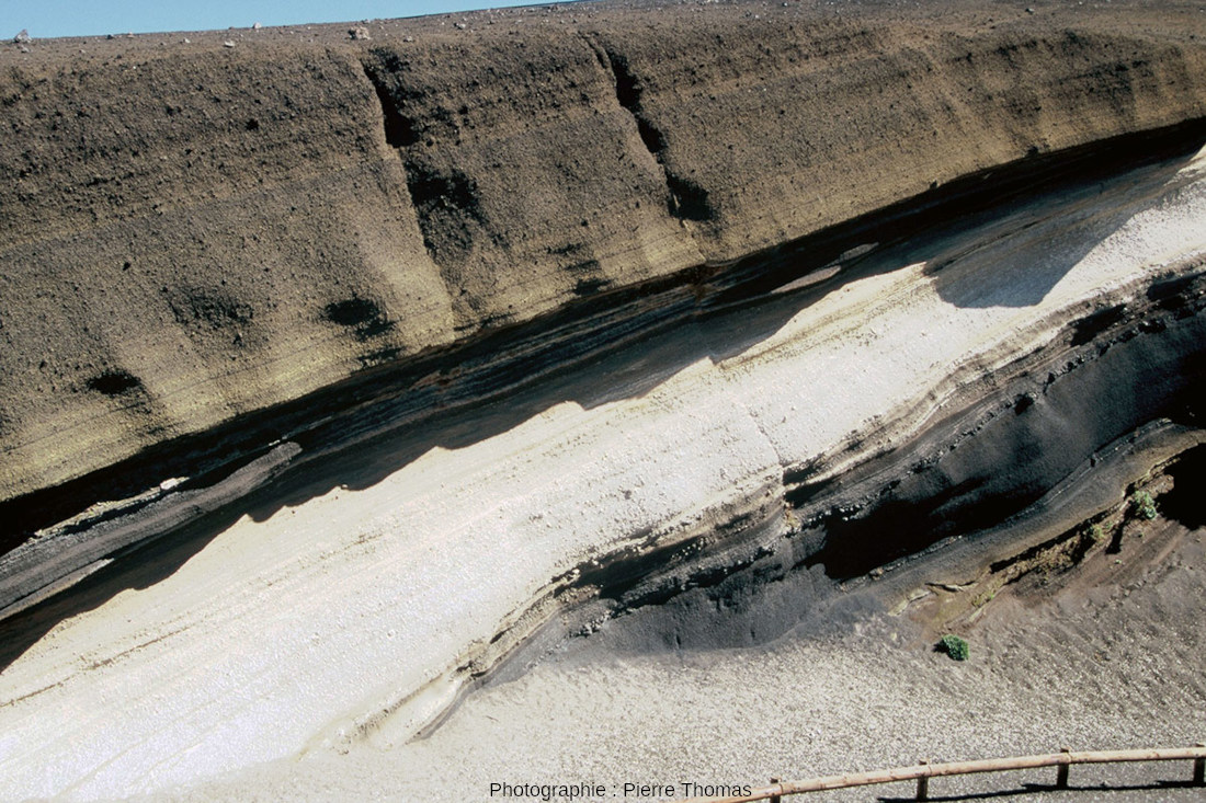 ![]() Source - © 2004 — Pierre Thomas On peut noter que les transitions supérieure et inférieure basalte/phonolite ne se font pas en une seule fois. On peut proposer que la retombée locale du panache plinien acide a eu lieu pendant que des éruptions basaltiques “stromboliennes” avaient lieu dans ce secteur du “rift” Nord-Ouest, d'où un mélange acide/basique avant et après le paroxysme plinien qui a déposé localement les 2 m de pyroclastites phonolitiques pures. |