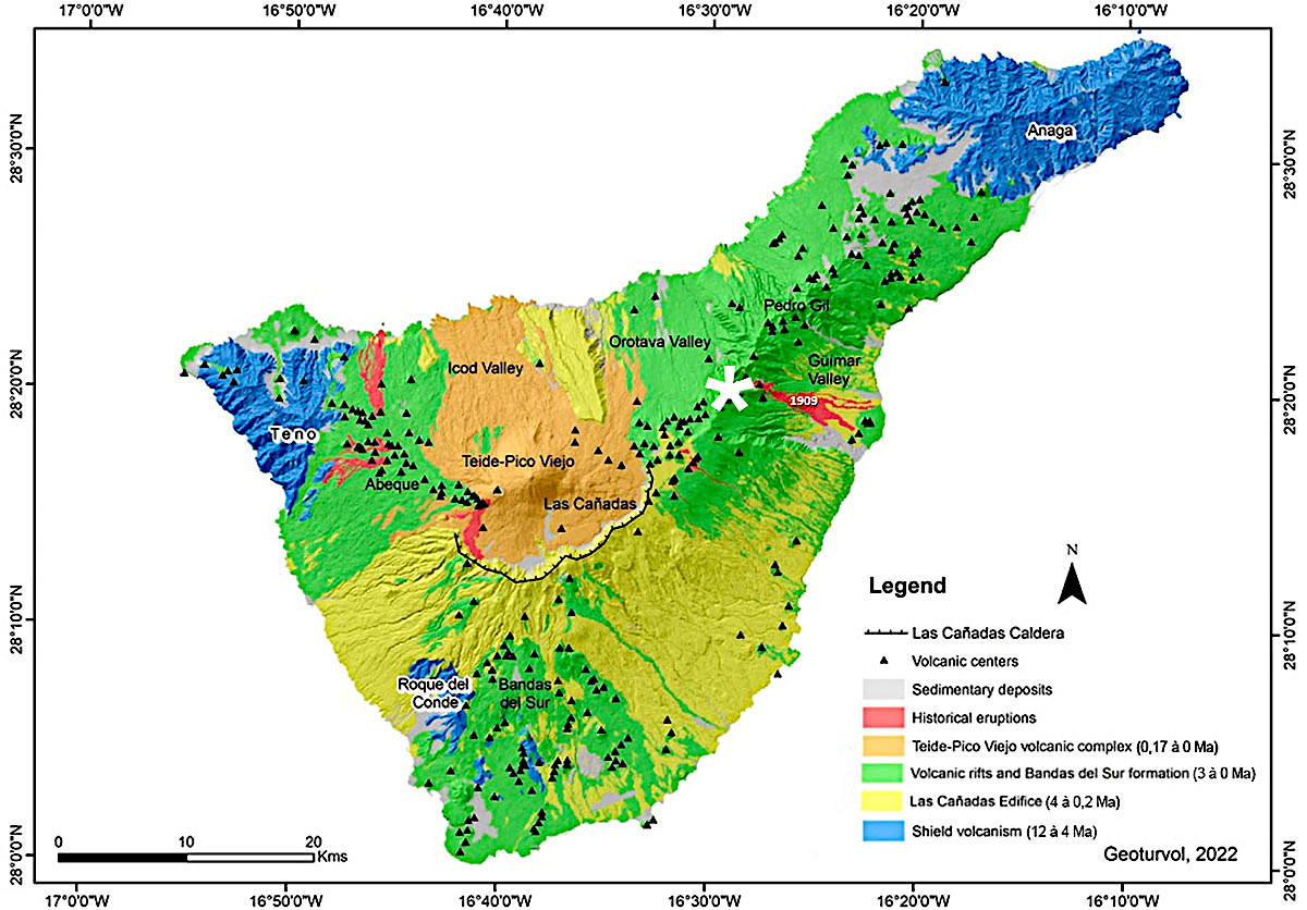 L'astérisque blanc localise la Tarta del Teide, quasiment sur la crête de la chaine de volcans basaltiques orienté SO-NE, connue sous le nom de “rift” (au sens de déchirure ou de crevasse, et non pas d'un graben à l'axe d'une dorsale) et active de −3 Ma à l’actuel (la dernière éruption qui a eu lieu à 2,7 km de là, date de 1909, voir figures 20 à 22). Un résumé de la géologie de l'ile est disponible dans l'article de la semaine dernière,Le Teide, ses coulées et ses cônes remplissant la caldeira de Las Canadas, ile de Tenerife, archipel des Canaries (Espagne).