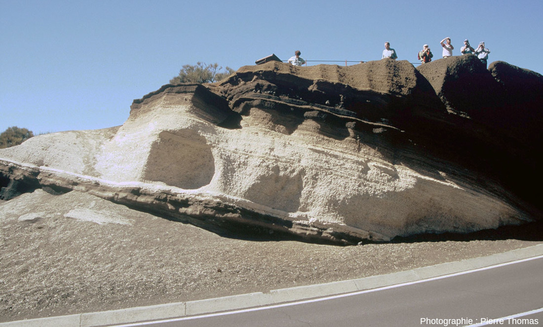 Ce niveau phonolitique est interstratifié dans des projections volcaniques sombres, très vraisemblablement basaltiques, issues de la chaine de volcans connue sous le nom de « rift », au sens de déchirure ou de crevasse, et non pas d'un graben à l'axe d'une dorsale (voir figure 4). Cet affleurement est appelé la « Tarta del Teide » (le « Gâteau du Teide »). Des parkings permettent aux touristes de s'y arrêter pour admirer cet affleurement (en Espagne, les affleurements géologiquement intéressants sont, contrairement à la France, très majoritairement signalés et accompagnés de panneaux explicatifs) et aussi le panorama sur le Teide (voir figure 16).