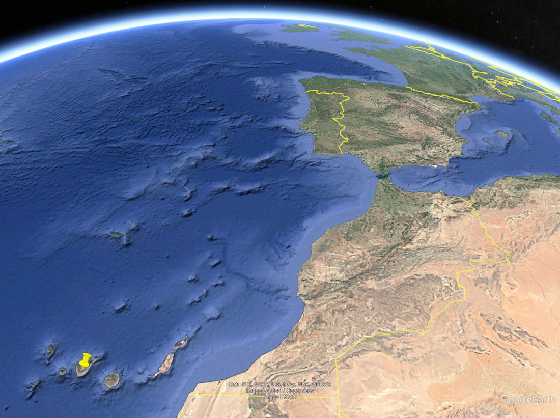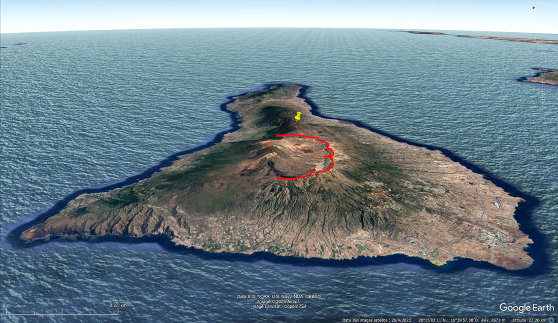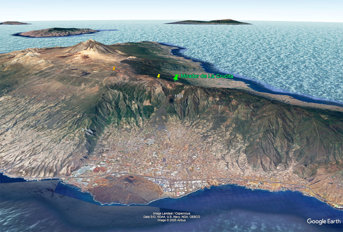 ![]() Source - © 2025 — D’après Google Earth La Montana de las Arenitas est indiquée par le chiffre 1909, date de son éruption. La punaise jaune localise la Tarta del Teide ; la punaise orange localise le complexe astronomique. | |