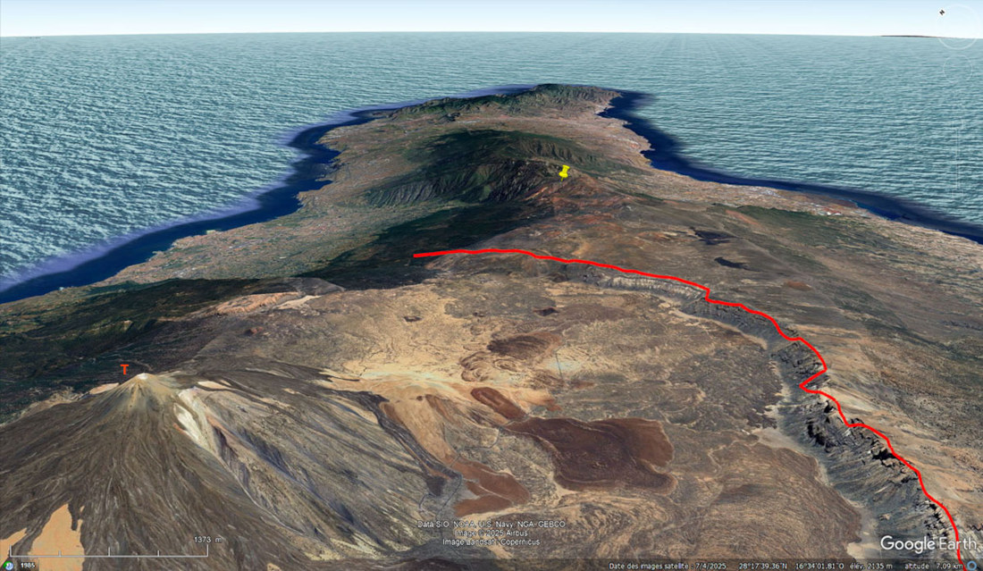 ![]() Source - © 2025 — D’après Google Earth Le site est situé sur une crête orientée Sud-Ouest-Nord-Est, alignement de volcans essentiellement basaltiques formant ce qui est appelé localement le “rift”. La part encore visible de la caldeira de Las Canadas est figurée en rouge, et le Teide est localisé par un T. |