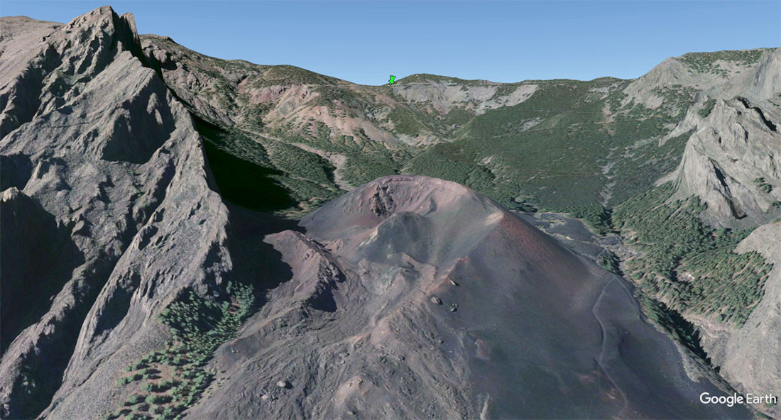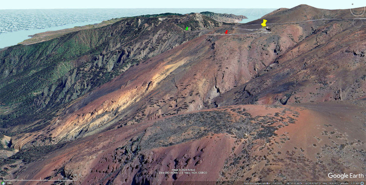 ![]() Source - © 2025 — D’après Google Earth La punaise verte localise le Mirador de la Crucita. Les trois images suivantes (Google Earth Steet View) ont été prises sur le bord de la route que l'on devine à droite du “mirador”, à respectivement 250 m (figure 22) et 50 m (figures 23 et 24). | |
