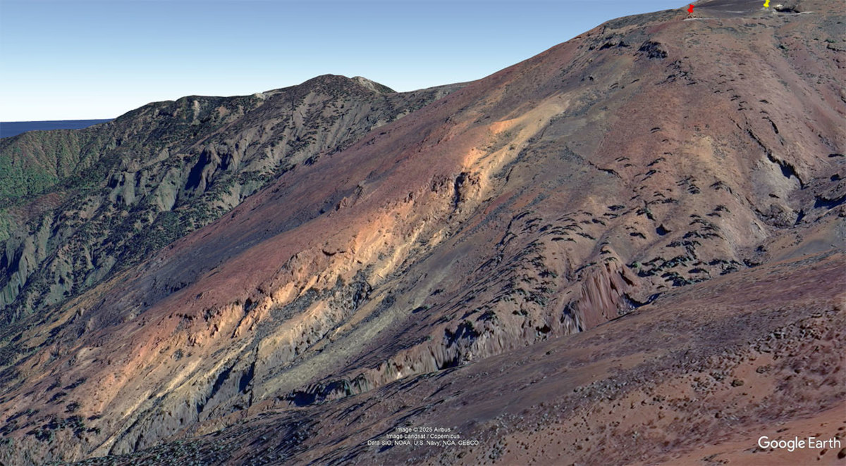 ![]() Source - © 2025 — D’après Google Earth Le “gros” de la montagne a des couleurs allant du rougeâtre au noir, couleurs caractéristiques des scories basaltiques (ou des basaltes massifs) plus ou moins altérés. À gauche en contrebas des virages de la route passant au niveau de la Tarta del Teide, une zone plus claire correspond sans doute à la couche phonolitique des figures 1 à 11 localement mise à l'affleurement par l'érosion des couches de scories basaltiques sus-jacentes. La figure suivante montre un détail de cette zone claire. Le pendage de cette zone correspond au pendage de la couche claire des figures 1 à 11 tel qu'on peut le déterminer d'après les photos, pendage parallèle à la topographie locale comme cela se voit sur les figures 6, 7 et 9. Les punaises rouge et verte correspondent aux sites où ont été prises les photos 16 et 17 d'une part, 19 et 20 d'autre part. |