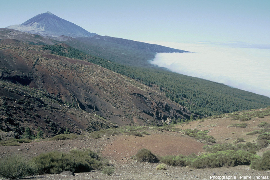 ![]() Source - © 2004 — Pierre Thomas Au fond, le Teide (3718 m). La mer de nuages présente en dessous de 1600 m en cet après-midi d'octobre montre la stabilité de l'atmosphère, une des raisons de l'installation des observatoires à moins de 4 km de là (cf. fig. 1 de l'article Le Teide, ses coulées et ses cônes remplissant la caldeira de Las Canadas, ile de Tenerife, archipel des Canaries (Espagne)). Sur le flanc opposé de la petite vallée d'où est prise la photo, on voit très bien deux dykes dont l'un est détaillé sur la photo suivante. |