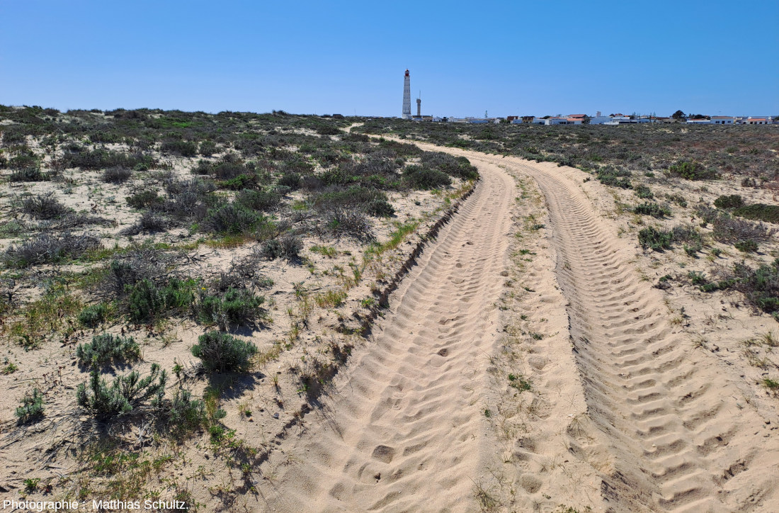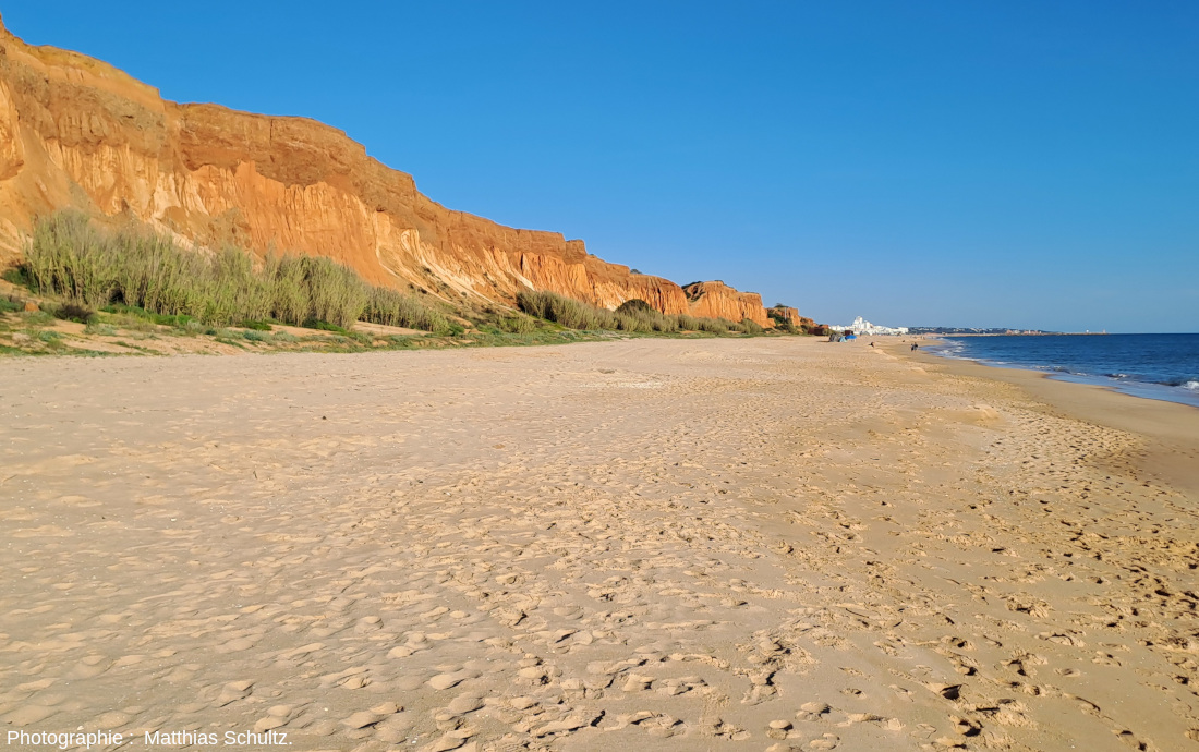 ![]() Source - © 2024 — Matthias Schultz Photographie prise en direction du Sud-Est et de la ville de Quarteira (bâtiments blancs visibles en fond). Les promeneurs donnent l'échelle : les falaises dépassent les 40 mètres de hauteur. On distingue bien la partie inférieure de la falaise, formée de grès orange mal consolidé avec une érosion en badlands, de la partie supérieure, formée de silts rouges. La limite stratigraphique semble subhorizontale mais assez irrégulière. |
