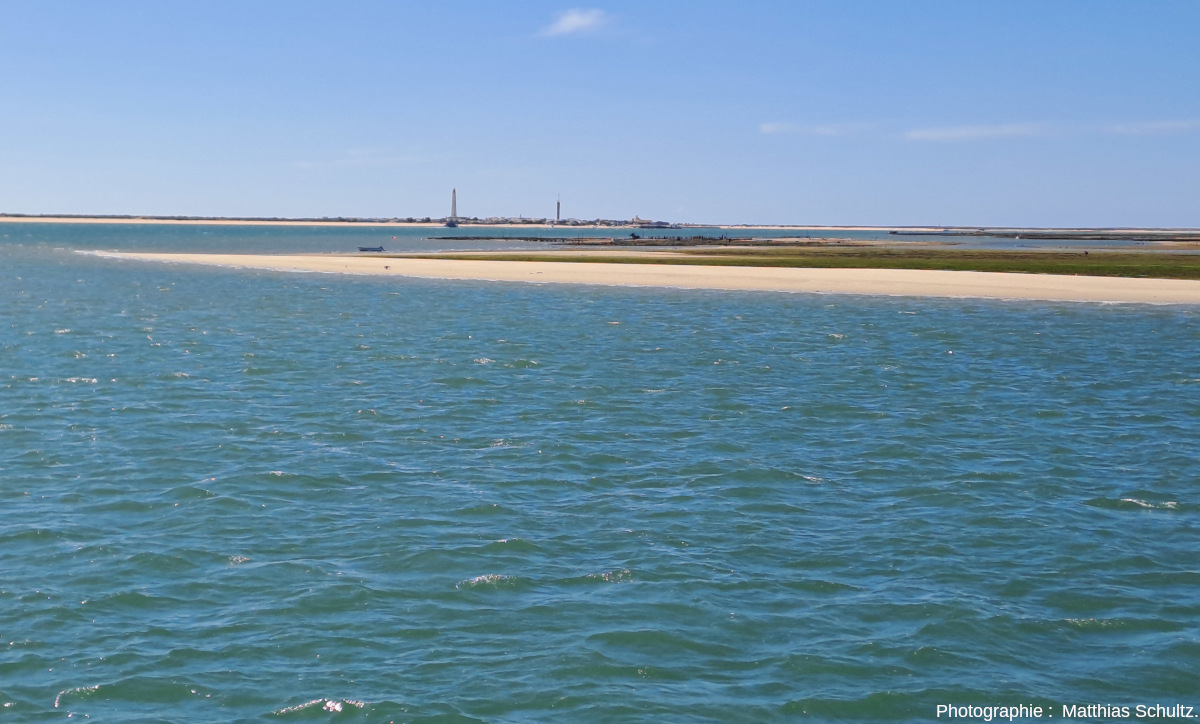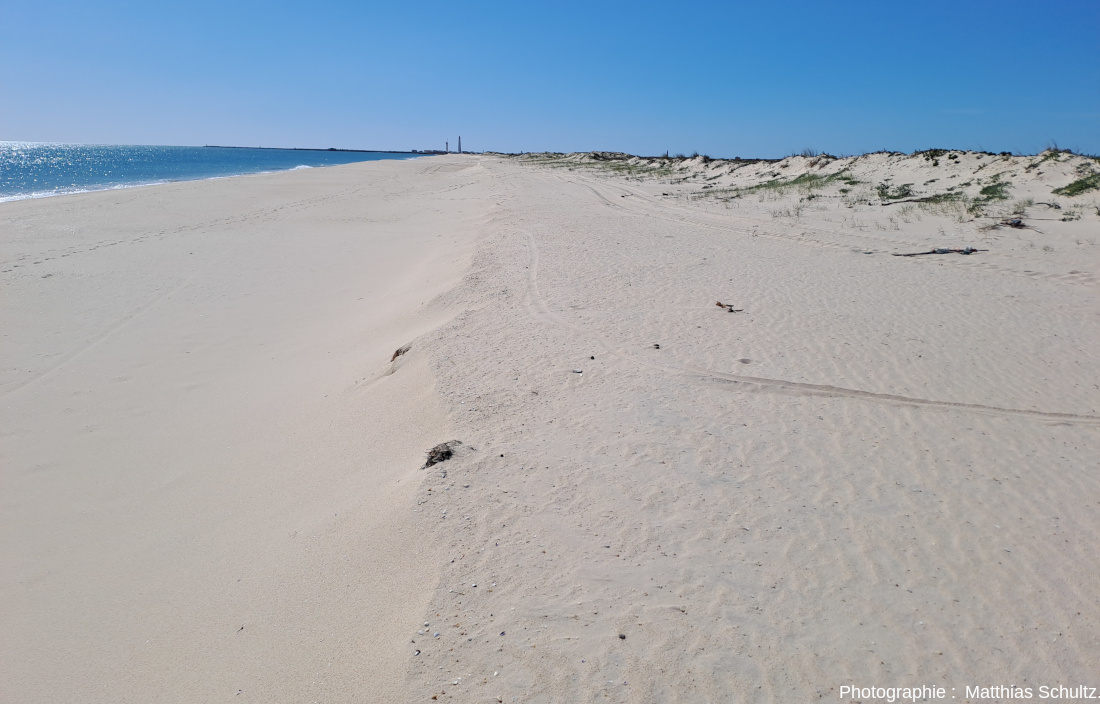 Falaises quaternaires de grès peu consolidés, blanchâtres à rougeâtres, avec quelques niveaux fossilifères. Dynamique actuelle d’environnement sableux à vasières et marais salants.