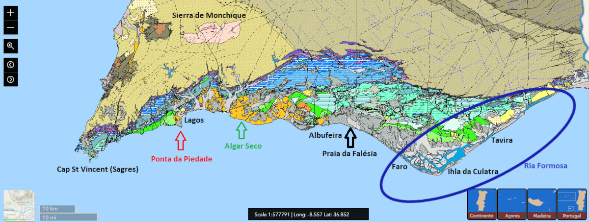 ![]() Source - © 2025 — D’après Geoportal Energia e Geologia , modifié La localisation de Praia da Falésia est indiquée par la flèche noire, dans les dépôts sédimentaires quaternaires figurés en gris pointillé, qui affleurent largement dans l'Est de l'Algarve, d'Albufeira à la Ria Formosa. Ce secteur de lagune et de côte basse est indiqué par une ellipse bleue à l'Est de Faro. On retrouve aussi sur cette carte la localisation des affleurements côtiers de Ponta da Piedade (en rouge) et d'Algar Seco (en vert), dans la formation miocène de Lagos-Portimão, figurée en orange, étudiée dans un article précédent (cf. Les falaises du Miocène de l'Algarve, au Sud du Portugal»). Plus généralement, les roches sédimentaires datées du Trias à nos jours constituant le bassin de l'Algarve se distinguent très bien, en position littorale au Sud, des roches plus anciennes (notamment carbonifères) au Nord. | |