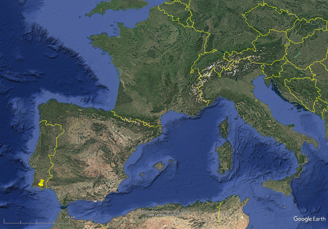 Localisation par fichier kmz de la plage et des falaises de Falésia, Algarve (Sud du Portugal).