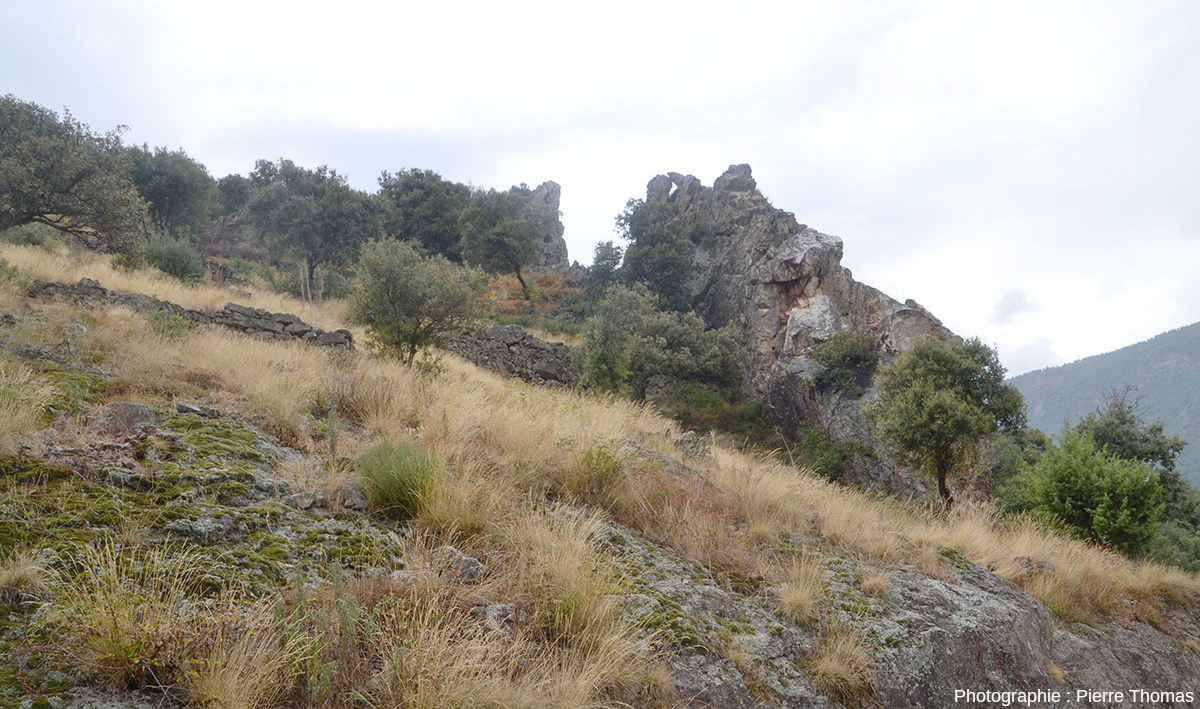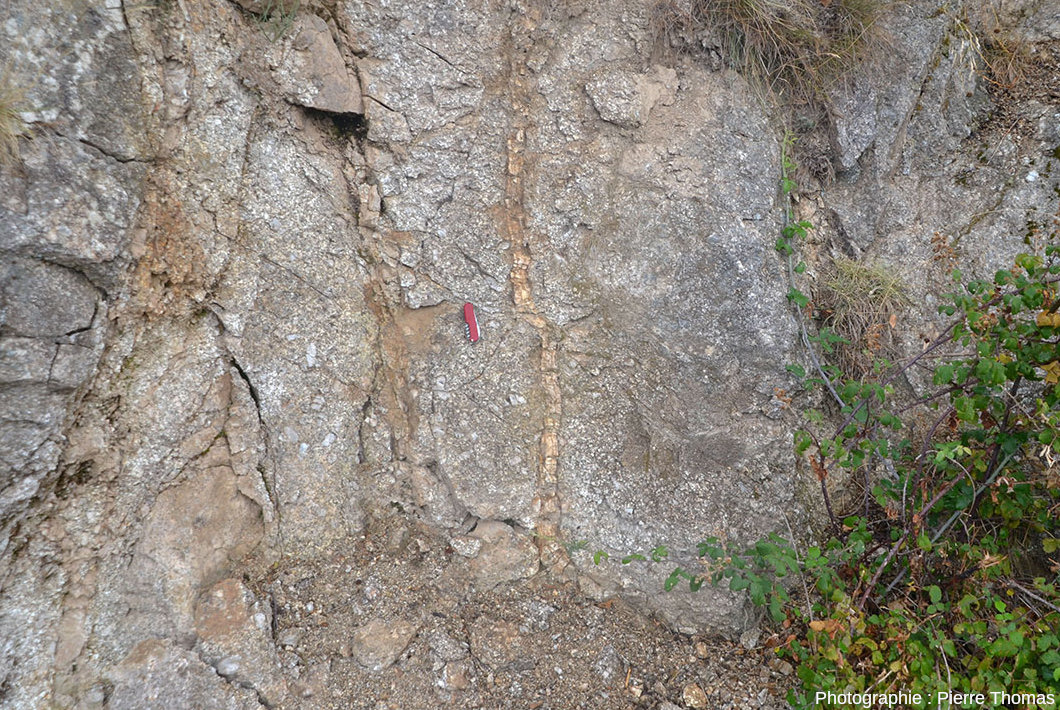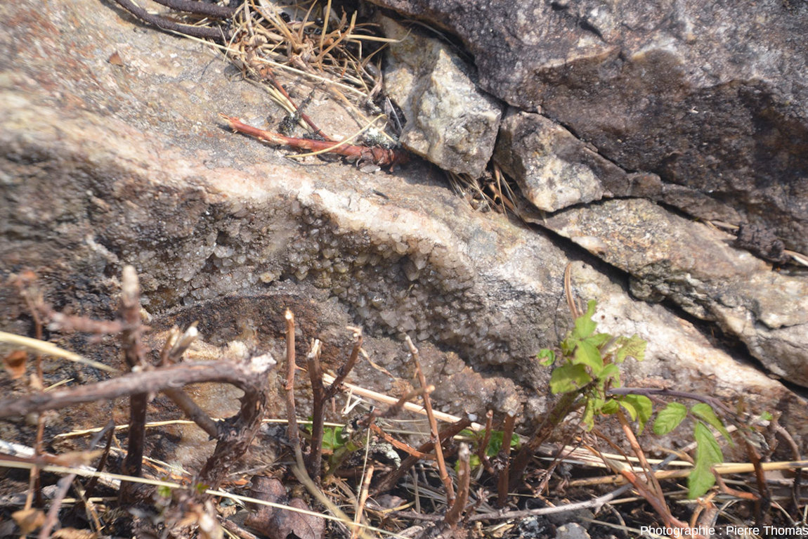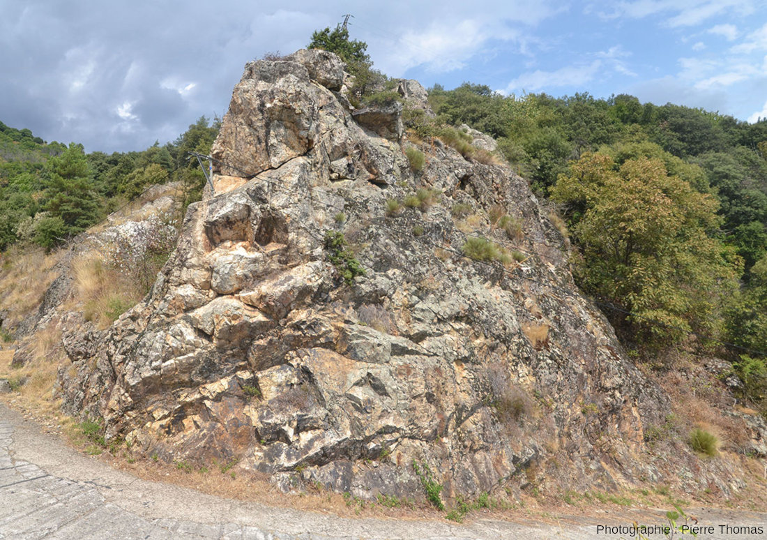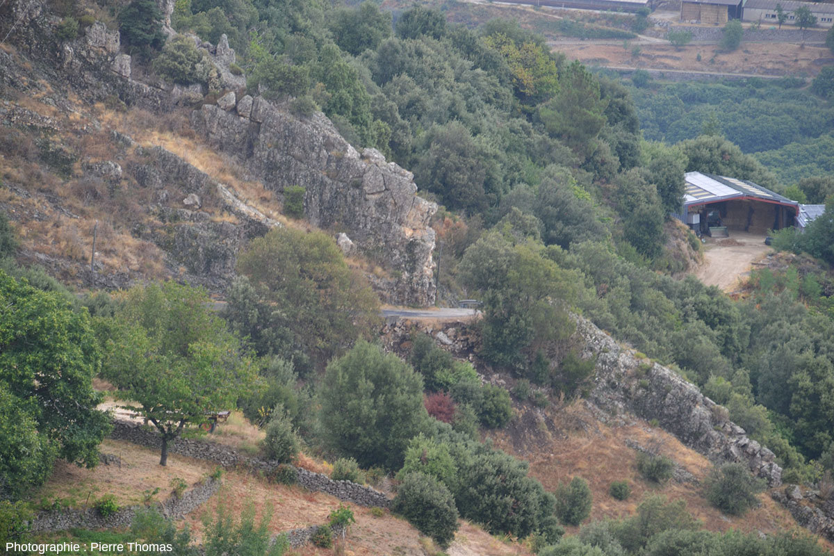 ![]() Source - © 2025 — Pierre Thomas Point 1 sur la figure 2. Ce filon est recoupé par une petite route. C'est au niveau de cette intersection qu'ont été prises les photos 1 et 10 à 14. |