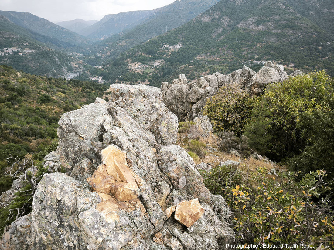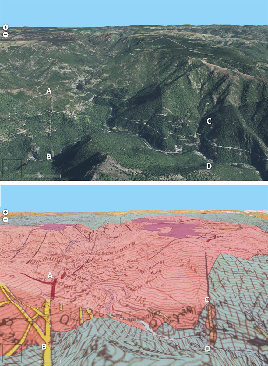 Nous avons déjà vu plusieurs fois des filons de quartz, aussi bien dans la chaine alpine (cf., par exemple, Filons de quartz des Alpes et d'ailleurs) que, comme ici, dans la chaine hercynienne (cf. Quelques filons de quartz dans la chaine hercynienne : l'ile Callot (29), Roche d'Agoux (63), Saint-Paul-la Roche (24)). En avril 2025, j'avais, par hasard, repéré un filon en survolant ce secteur de Lozère-Ardèche (cf. Survoler l'Ardèche en avion à l'Ouest de Montélimar, 2/ le socle hercynien). Cet été, je suis allé voir à quoi ressemblait ce filon vu du sol. Ce qui rend ce filon de quartz assez exceptionnel, ce ne sont pas la beauté de ses cristallisations assez décevantes, mais sa visibilité dans la morphologie et ses dimensions (environ 10 m de large, 1 100 m de long bien visible dans la morphologie, 4 400 m au total d'après les cartes géologiques de Largentière et de Bessèges).