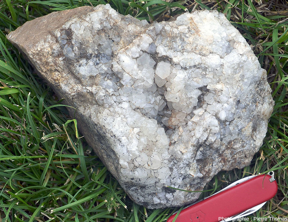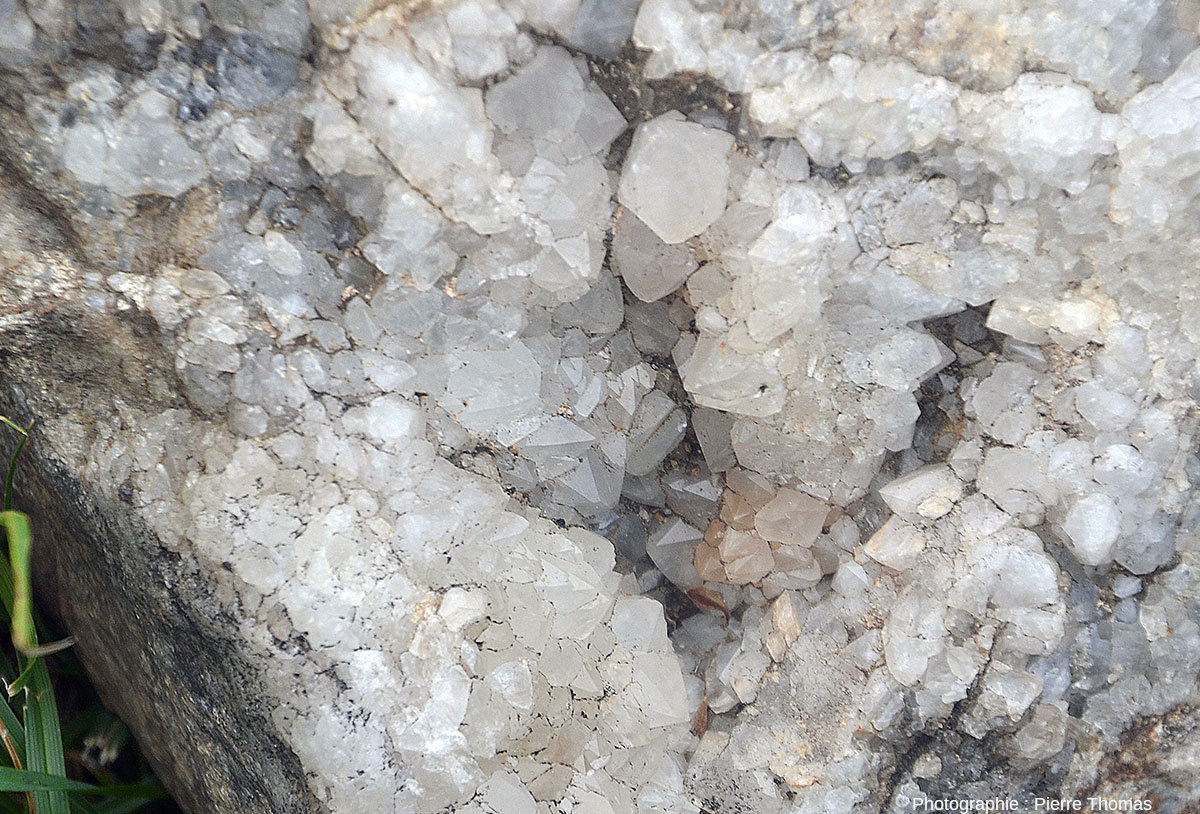 Les filons de quartz, et ceux d'autres substances comme la barytine, la fluorine… sont des filons hydrothermaux, fréquents dans les séries métamorphiques, autour des intrusions granitiques… Leur genèse peut se résumer-simplifier de la façon suivante : des inégalités de températures entrainent des circulations convectives d'eau à travers des réseaux de fractures préexistantes. En particulier, des eaux chaudes, très souvent supercritiques (cf. L'état supercritique en sciences de la Terre ou encore Comment se forment les cristaux ? Du bécher à la croissance hydrothermale) riches en silice dissoute, remontent par des fractures. Si la température et/ou la pression baissent suffisamment, la solubilité de la silice diminue, du quartz se dépose sur les épontes de part et d'autre de la fissure, et finit par la colmater. Si des secteurs échappent au remplissage total, il reste des cavités (des géodes) dans lesquelles on peut voir la forme des cristaux automorphes comme sur les quatre figures précédentes. L'histoire peut être plus compliquée, car l'ouverture de la fissure peut se faire lentement et de façon continue, ou au contraire par à-coups lors de séismes. Une fois la fissure colmatée, un nouvel écartement peut rouvrir une nouvelle fissure à l'intérieur du colmatage précédent, et plusieurs générations de quartz peuvent se recouper. Pour un filon d'une dizaine de mètres de large comme celui des Aidons, il est très probable qu'ouvertures et remplissages se sont fait en plusieurs étapes, étalées sur des années et des années. Combien d'années ?