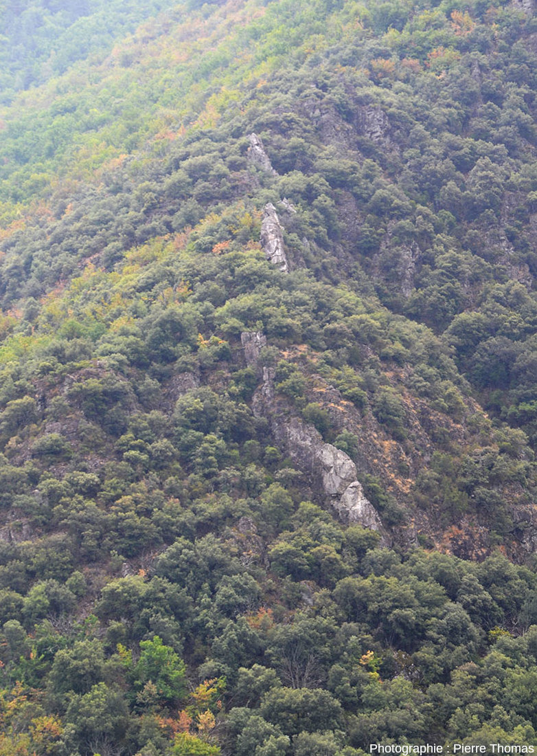 ![]() Source - © 2025 — Pierre Thomas Depuis le point 2 de la figure 2, en regardant le versant d'en face, on voit deux très probables filons de quartz dépassant de la forêt. La géométrie de ces filons laisse penser au remplissage de deux fissures en échelon (cf. Fentes en échelons dans les Alpes, les Pyrénées et le Sahara). |