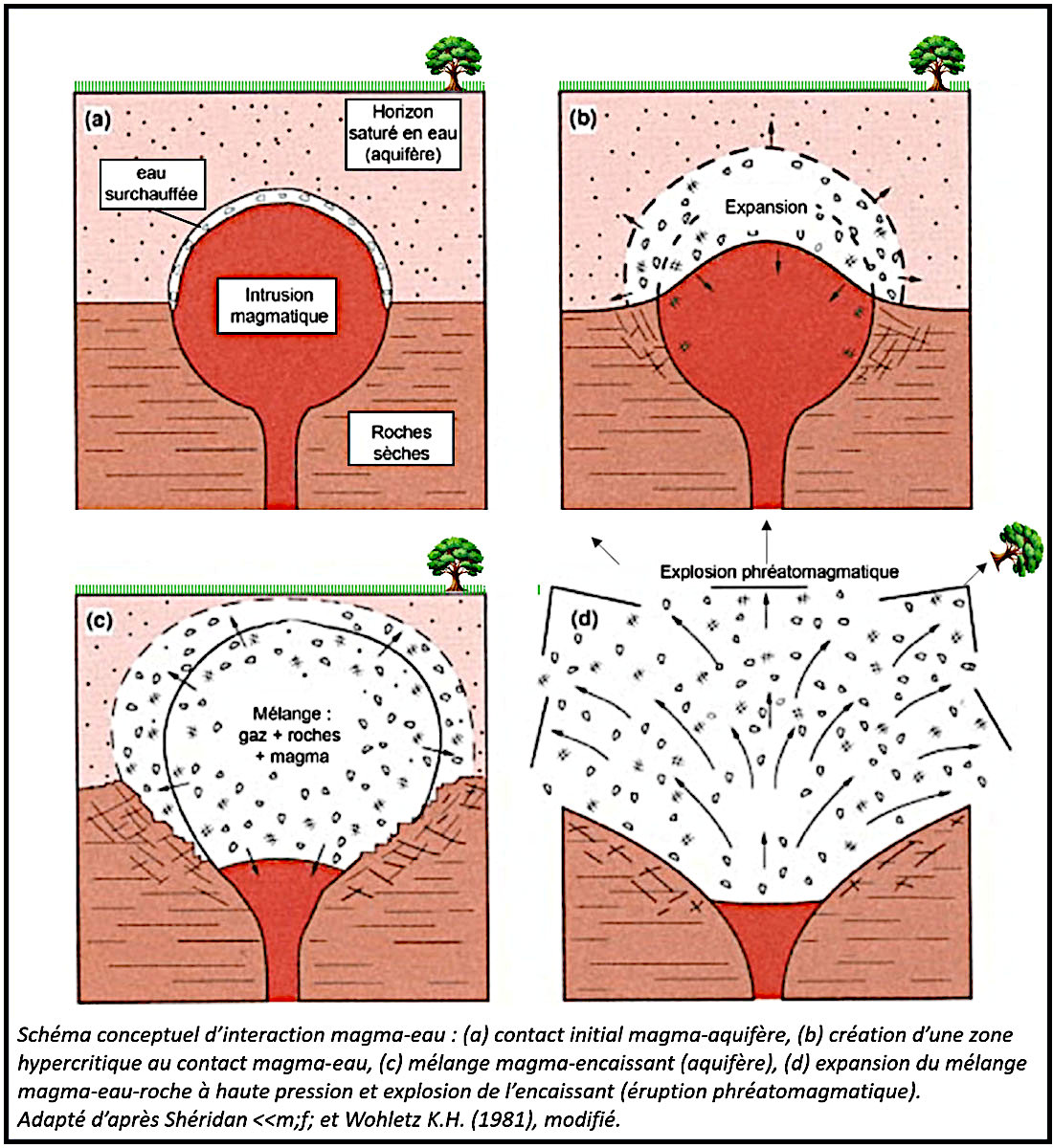 ![]() Source - © 2015 — D'après M. Detay, modifié Ce schéma explicite et met en valeur le rôle de la vaporisation de l'eau contenue dans un aquifère (nappe phréatique) et de l'explosion due à la surpression conséquence de cette vaporisation. Schéma extrait et modifié d'après la figure 8 de Introduction à l'hydrovolcanologie(lien externe - nouvelle fenêtre). Ce schéma est également repris dans la notice de la Carte volcanologique de la Chaine des Puys, 6e édition, 2019. |
