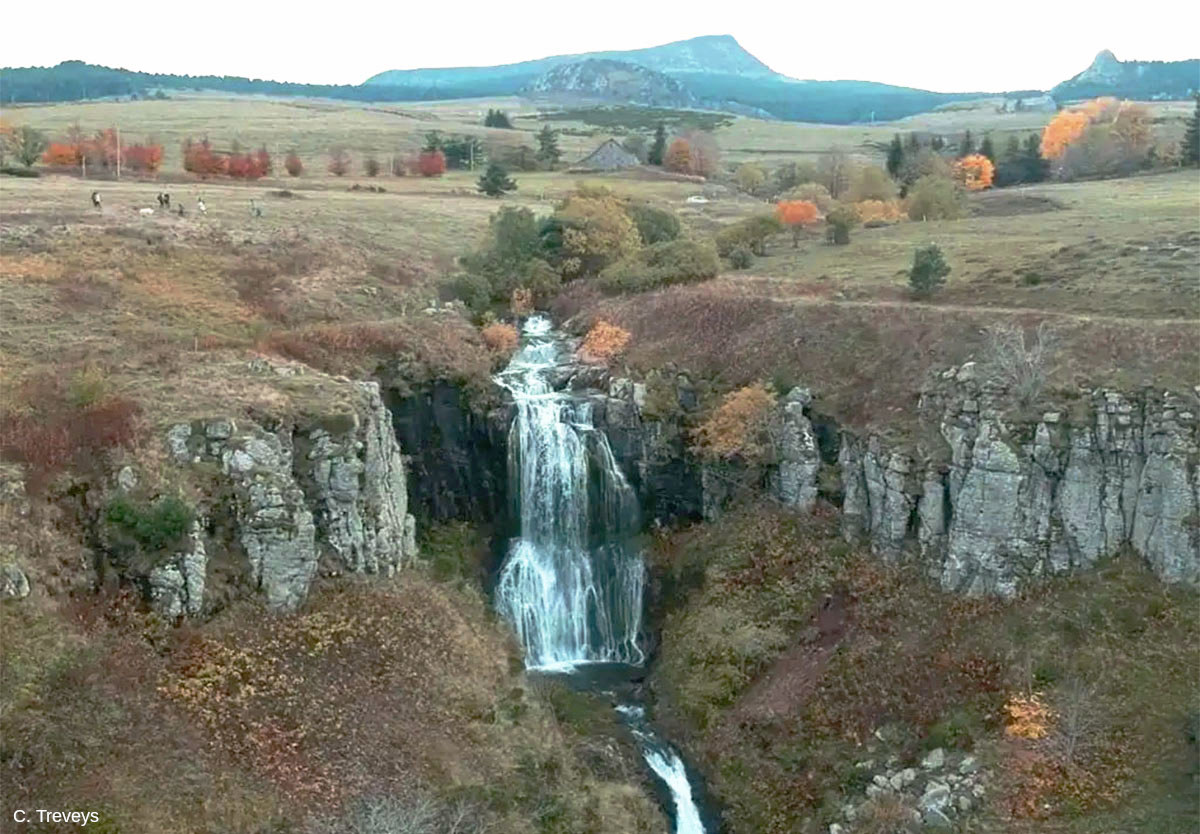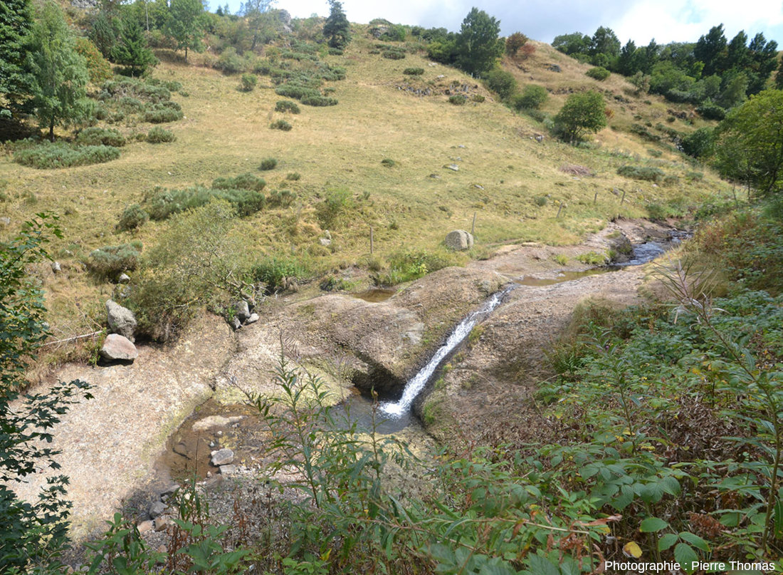 Le couvert végétal, l'absence d'affleurement et la brièveté de mon séjour sur place ne m'ont pas permis de déterminer la position, la géométrie et la nature des contacts entre cette brèche, les vieilles coulées de basalte qui dominent topographiquement cette brèche et les sédiments lacustres qui remplissent le maar. Il faudrait faire une cartographie de détail des rares affleurements, et éventuellement quelques tranchées. On ne peut donc pas vérifier rapidement si l'hypothèse proposée à la figure précédente est légitime ou non. Cette ignorance (provisoire ?) n'empêche pas d'aller au fond de la vallée pour admirer la cascade.