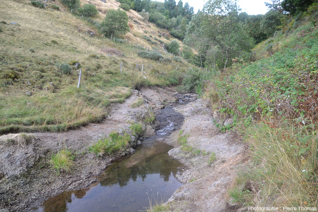 ![]() Source - © 2025 — D'après Google Earth La punaise jaune localise le site où ont été prises les photos 10 à 12, là où le ruisseau recoupe la limite topographique entre la dépression que constitue le maar et le plateau basaltique. | |