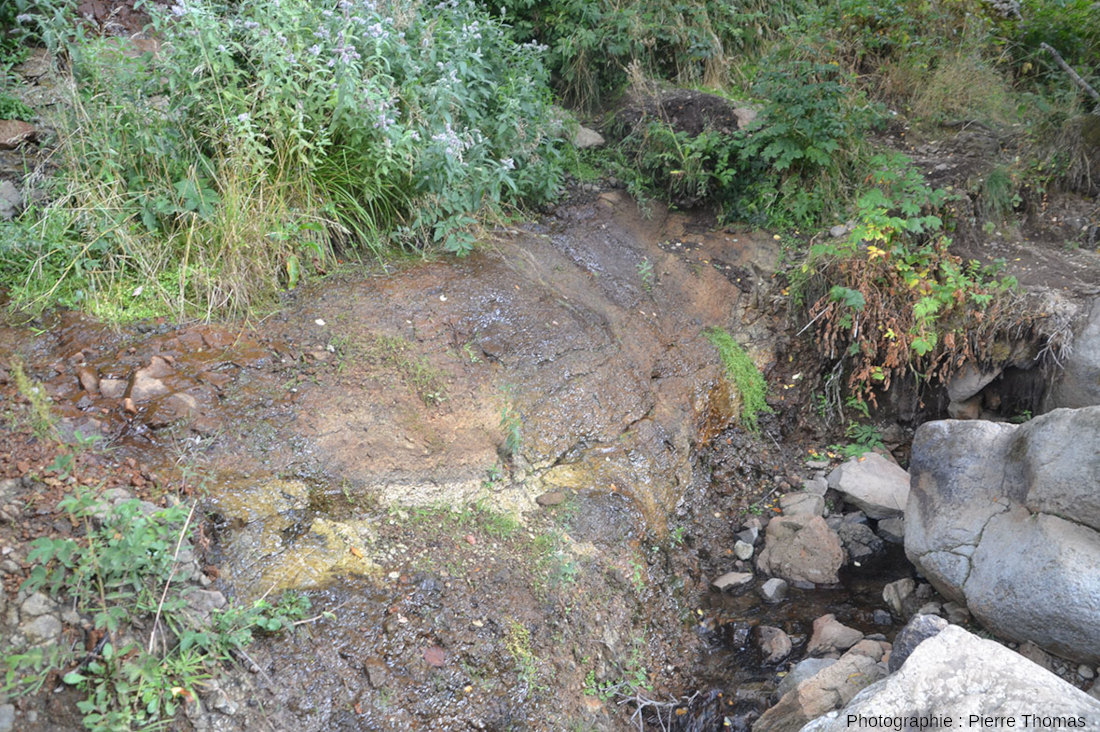 ![]() Source - © 2025 — Pierre Thomas La couleur “rouille”, les irisations et les reflets brillants montre une eau riche en Fe2+, Fe2+ oxydé en Fe3+ (cf. figures 22 à 25 de Les sources thermominérales d'Auvergne : chimiolithotrophie et photosynthèse ou encore Tourbes et oxydes ferriques : une manière d'étudier les métabolismes bactériens sur les plages landaises), oxydation très vraisemblablement due à des bactéries chimiolithotrophes. La présence de ces sources minéralisées peut expliquer le nom du ruisseau (le Salin) et celui d'un ruisseau voisin, la Saliouse (figure 17). Ces sources, comme c'est souvent le cas en pays volcanique, doivent être riches en Na+, en plus d'être ferrugineuses. | |