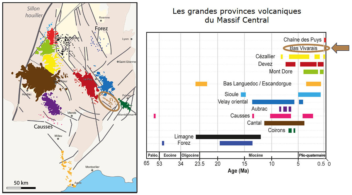 La flèche violette localise le maar de Chaudeyrolles et le volcanisme du Bas Vivarais.