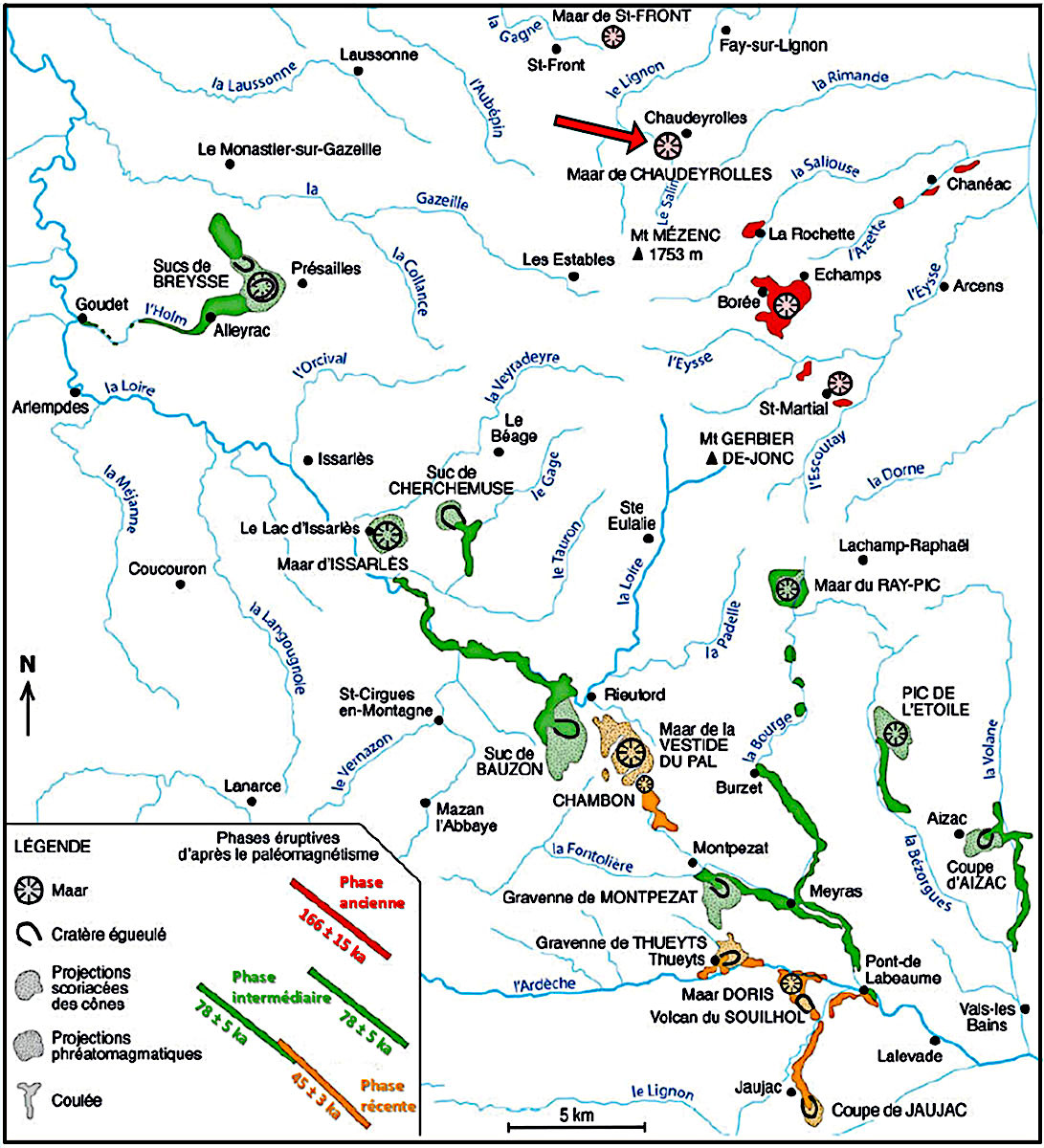 Il y a trois phases magmatiques dans cette province magmatique, datées d'environ 170 000, 80 000 et 45 000 ans. Ces 3 familles correspondent à trois alignements d'édifices volcaniques. Le maar de Chaudeyrolles (indiqué par une flèche) est situé sur le plus vieux et le plus au Nord de ces alignements.