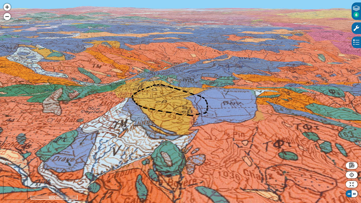 ![]() Source - © 2025 — BRGM / Géoportail La morphologie du maar (en tiretés noirs) est fortement oblitérée car le volcanisme a continué après les épisodes phréatomagmatiques avec remplissage de la dépression par un lac de lave (en bleu) et des édifices “stromboliens” (en orangé). Les dépôts de maar (en gris bleu) sont exploités par une carrière, la carrière de Molines (cf. figure 24 à 36 de École de Terrain - Le volcanisme du Velay). |
