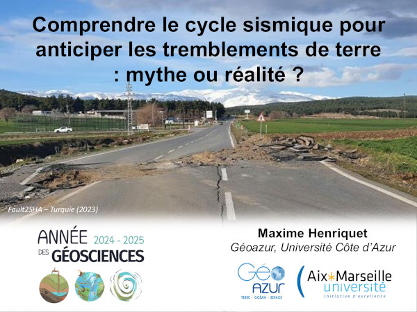 Maxime Henriquet, maitre de conférence au laboratoire Géoazur – Université Côte d’Azur, présente tout d’abord l’historique de la compréhension des séismes et de la modélisation de type “rebond élastique”, puis comment cela s’inscrit dans la tectonique des plaques. Après une présentation des modèles de prédictibilité des séismes et de leurs limites, les principaux axes de recherche actuelle en sismologie sont exposés avec résultats et perspectives.