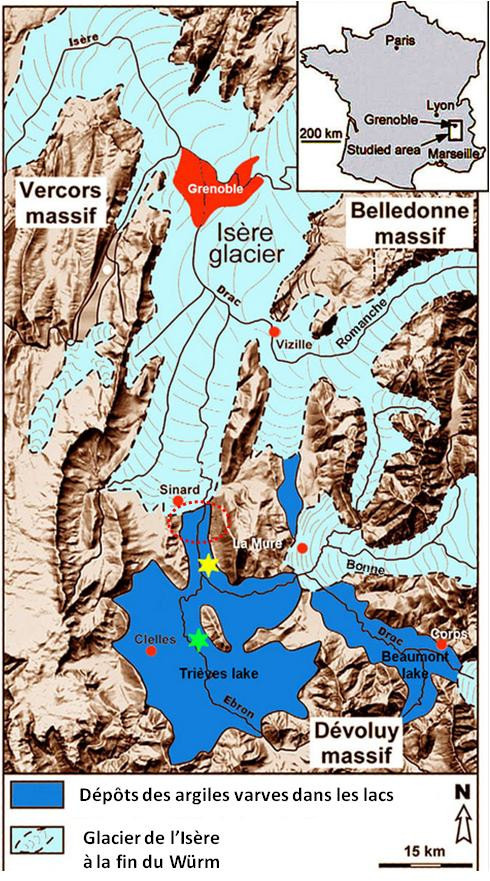 Le Würm est une période glaciaire du Pléistocène dans les Alpes. Elle s'étend de 115 000 à 11 700 ans avant le présent (AP[1]). La carte suivante montre la position du glacier de l'Isère à cette époque. La zone de Sinard est cerclée de pointillés rouges. À cette époque, des lacs glaciaires se forment au Sud dans la zone du Trièves. L'érosion des piémonts du Vercors et du Dévoluy amène cycliquement des sédiments et notamment des argiles qui se déposent au fond du lac (Jongmans et al., 2009[14] ; Thomas, 2021[19]).