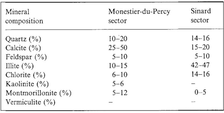 Les varves du Trièves sont des argiles. Ce sont en fait des mélanges d'argiles, de silts et de sables fins lités déposés dans un lac de barrage glaciaire. À l'époque du Würm, dans un environnement froid et gelé, l'apport biogénique est réduit. Ces varves sont donc principalement d'origine clastique (issues de l'érosion). La figure suivante donne la composition minéralogique des varves du Trièves.