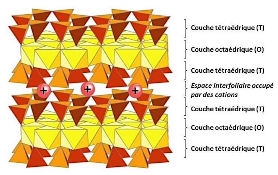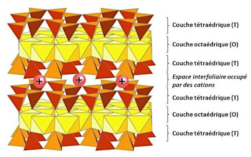 On s'aperçoit des disparités de composition minéralogique en fonction des sites. Ceci est lié principalement à la géologie des bassins versants. Pour la zone de Sinard, nous prendrons comme exemple le minéral le plus abondant qui est l'illite. Au niveau atomique les argiles sont comme des sandwichs empilés les uns sur les autres. On peut les imaginer également comme un livre. En effet chaque couche est appelée un feuillet. La figure suivante illustre la structure TOT (Tétraédrique Octaédrique Tétraédrique) de l'illite.