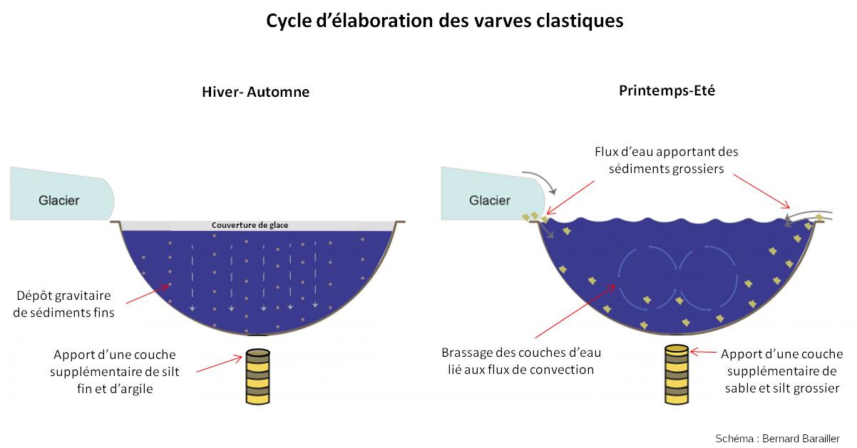 Au printemps, lorsque le courant est plus fort, les particules sédimentaires entrainées sont plus grossières. Lorsque le lac est gelé, les couches d'eau se stabilisent, les fines particules en suspension se déposent alors. Pour chaque cycle annuel, ceci forme deux couches, l'une grossière et plus claire (printemps-été) et l'autre fine et plus sombre (hiver-automne) (figure 7). L'existence de varves implique également un lac assez profond pour qu'il n'y ait pas de brassage des sédiments par des courants de convection d'eau.