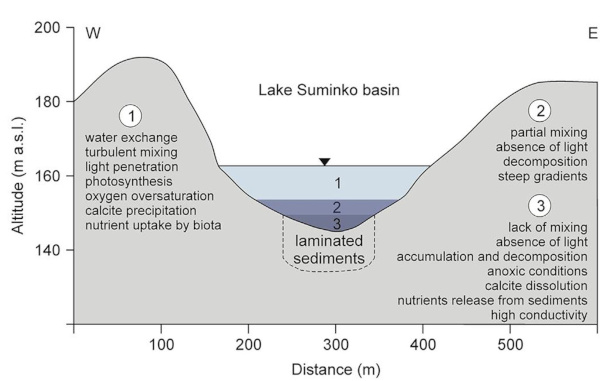 Un lac idéal est profondément encaissé dans le bassin versant, entouré de terrains surélevés limitant l'influence du mélange dû au vent. Le lac Suminko (figure 8), dans le Nord de la Pologne, en est un exemple et montre que les sédiments laminés en continu sont limités à la partie la plus profonde et sans oxygène de la colonne d'eau. En outre, il est caractérisé par un profil de profondeur lacustre avec un centre de dépôt relativement plat, un taux de sédimentation relativement élevé et des pentes stables qui évitent les affaissements et la sédimentation turbiditique. Enfin, les centres de dépôt peuvent être situés à proximité de l'entrée des rivières et recevoir de la matière minéralogique allochtone. Ceci nécessite une profondeur généralement supérieure à 20 m (Zolitschka et al., 2015[22]).