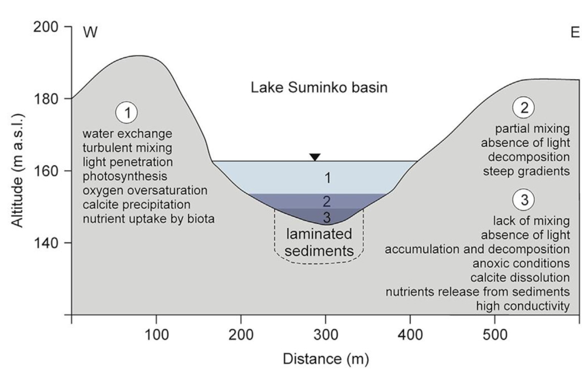 La situation du lac du Trièves à l'époque du Würm pourrait être comparable à celle du lac Suminko. Dans la zone où se développent les sédiments lités (varves), il n'y a pas de brassage d'eau, la lumière ne parvient plus, des conditions anoxiques sont alors possibles.