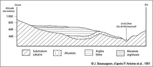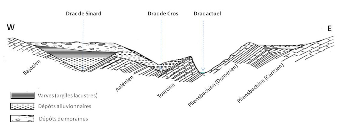 La coupe géologique suivante (figure 9) sur la zone de Sinard montre les argiles litées ainsi que le profil des rivières et lacs qui sont apparus progressivement. Le Drac a changé de lit au cours du temps, entaillant à chaque fois le substratum calcaire. Des colmatages d'alluvions fluviatiles ont pu se produire durant l'interglaciaire Riss-Würm. Ces derniers dépôts, ainsi que la topologie des lieux, ont alors été propices à la création des varves.