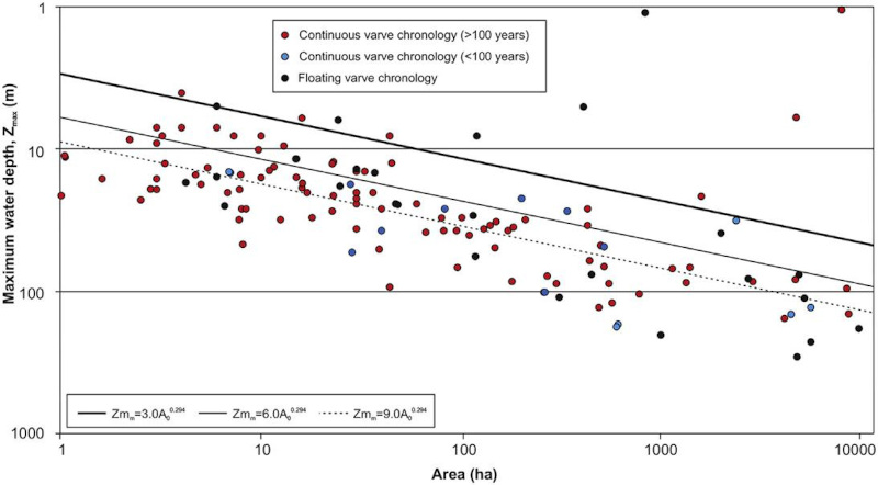 La figure suivante montre les profondeurs des lacs avec varves en fonction de leur surface (Zolitschka et al., 2015[22]).