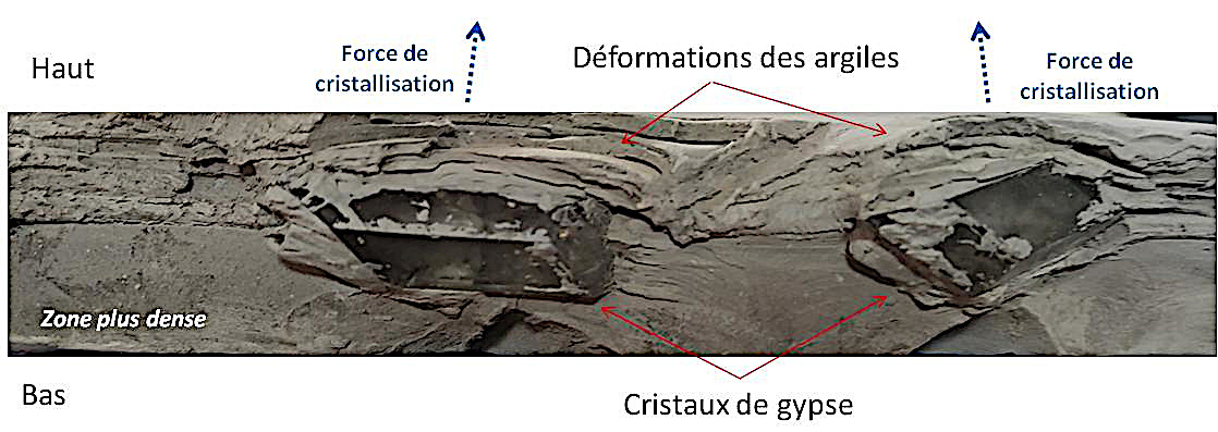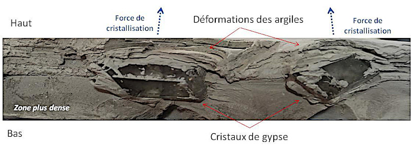 En étudiant l'environnement, les conditions de formation et les caractéristiques des argiles varvées, il apparait que les conditions étaient propices à ce que la croissance de gypse exerce une pression sur son environnement. Ainsi, bien que les gypses soient tendres, ils ont déformé les argiles et les ont même déchirées par endroits. C'est l'effet de la force de cristallisation, observée dans divers environnements géologiques et techniques : « elle soulève des montagnes » !