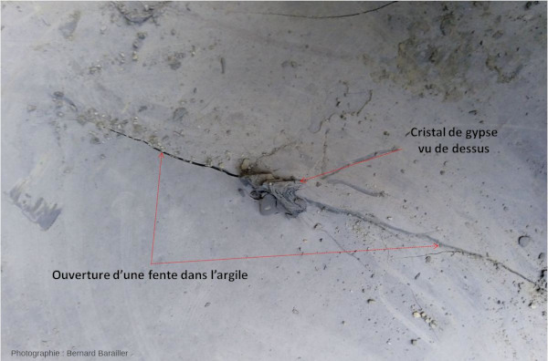 Voyons maintenant comment un cristal (le gypse, ici) peut exercer une force sur son environnement extérieur (des argiles) lors de sa croissance.