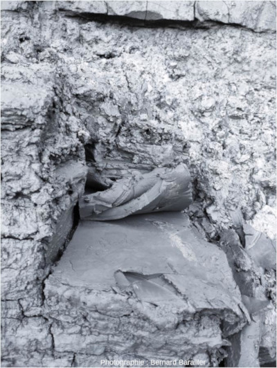 En analysant des échantillons orientés sur gangue, on s'aperçoit que les argiles qui sont au-dessus des gypses ont subi une déformation plastique (figure 13). Par ailleurs, concernant la résistance des matériaux, au-delà d'un certain seuil (limite plastique) la couche d'argile s'est déchirée (figure 14). La couche d'argile sous-jacente sur laquelle est posé le gypse est peu déformée et parait plus homogène et plus dense.